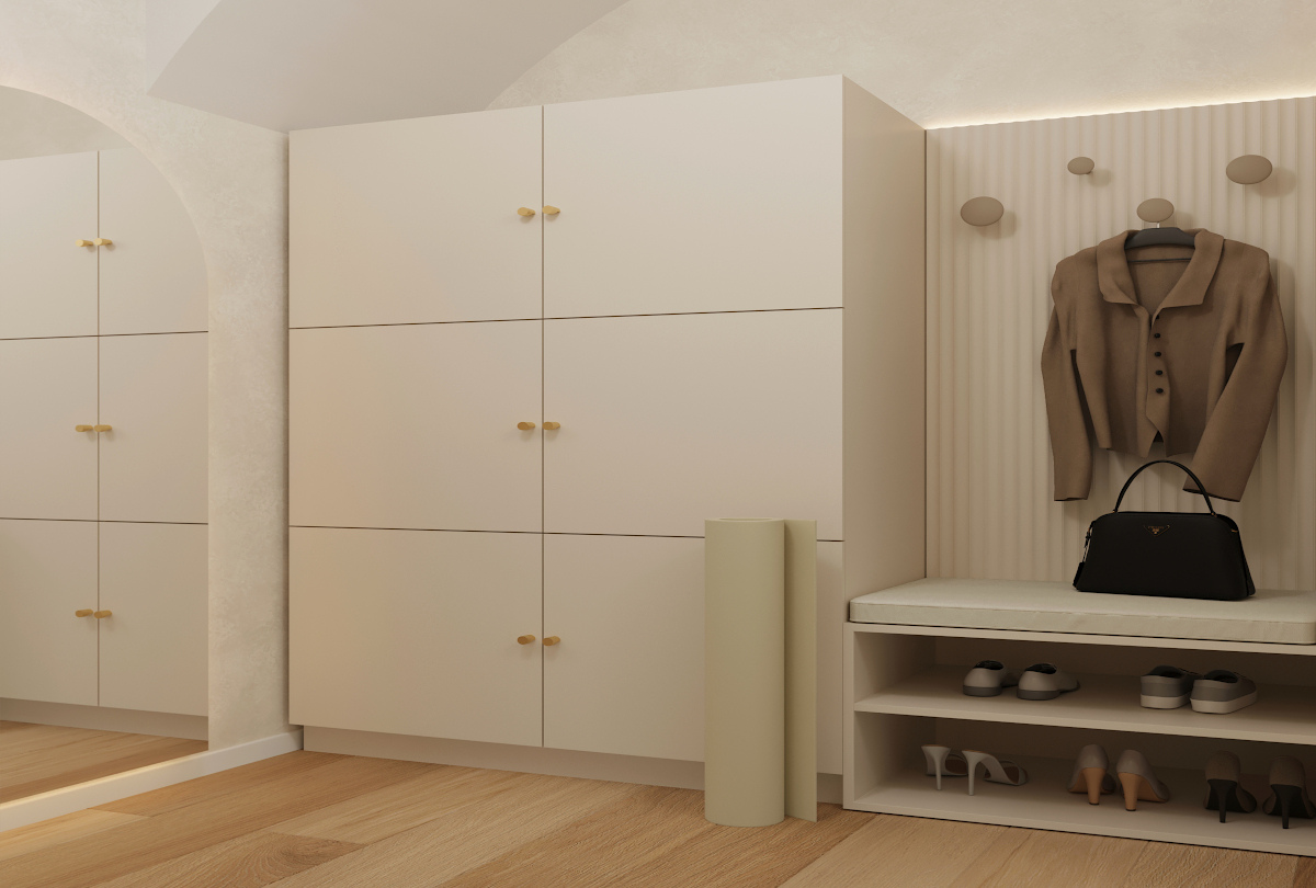 Az épület adottságaiból kiindulva és inspirálódva, a prémium design koncepcióban is a boltíveket jelenítettük meg, ez látható a recepció, a váró rész, és a pilates eszközök tárolására fenntartott hely mögött is, a teakonyhában a bútoron, a kutyasarok bútorán, és természetesen megjelenik a hatalmas boltíves tükrökben is. Nagy hangsúlyt fektettünk a világításra, design függesztékek, valamint rejtett LED világítások kerültek a stúdióba.