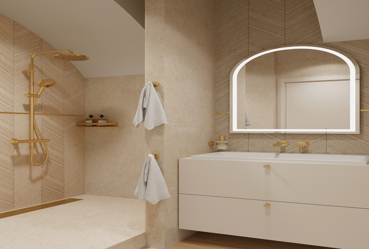 A színek tekintetében a visszafogott világos színek fognak dominálni, a világos tölgy a padlóburkolaton, a különleges világos falfestés a falakon, a vendégek számára fenntartott mosdó és fürdőszobában szintén exkluzív világos kőburkolat lesz. Az elegancia jegyében ehhez kiegészítő színnek kasmír szürkét és aranyat választottunk. Az egyedileg tervezett recepciós pult mögött szépen érvényesül a stúdió logója.