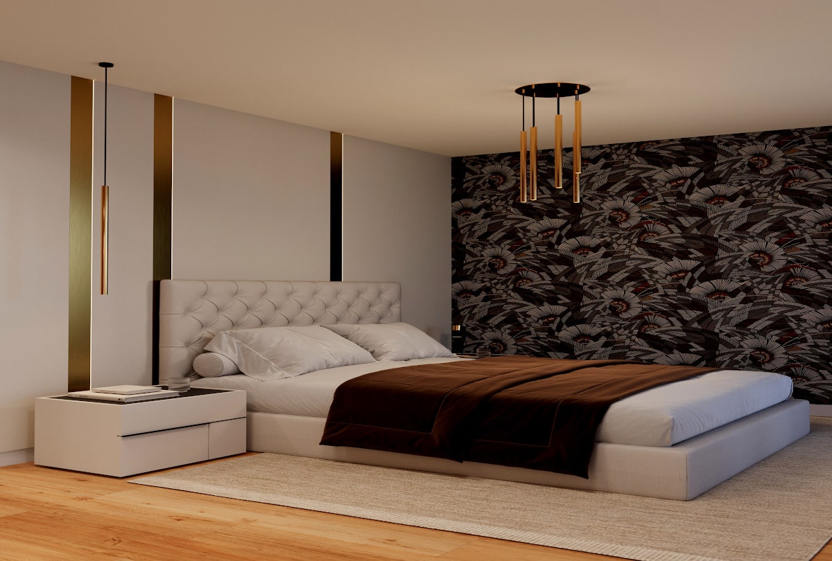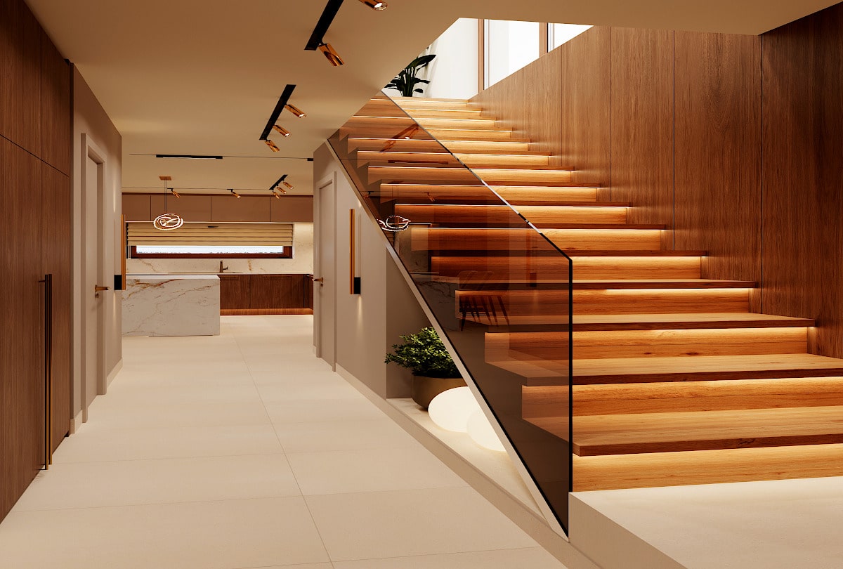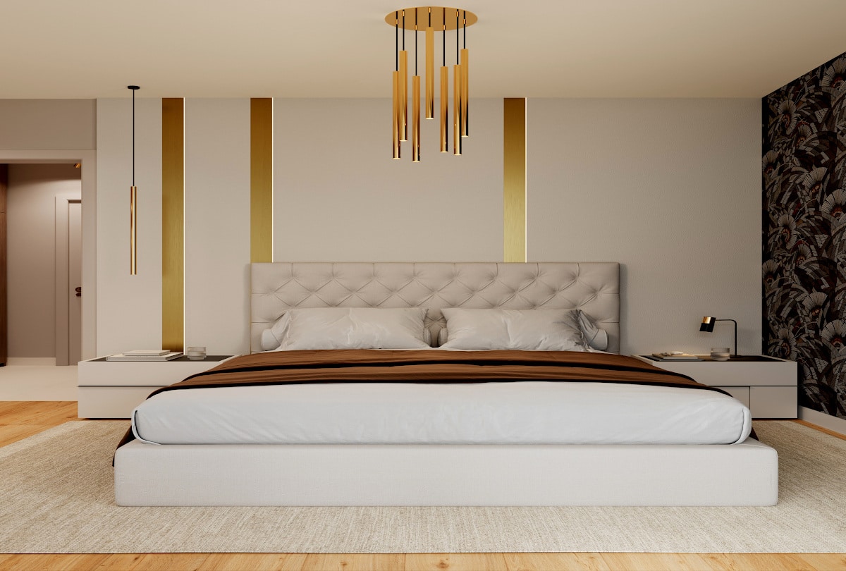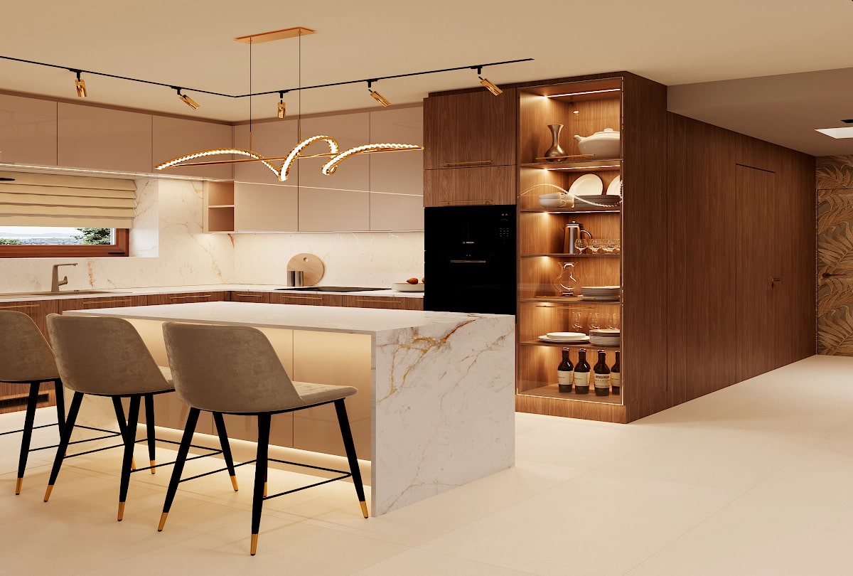 A földszinten a matt hatású padlóburkolat adja a visszafogott alapot, amit fényes felületek emelnek ki – ezek a bútorok egyes frontjaiban jelennek meg. Ezek a fényes frontok és a diófa felületek harmonikusan kiegyenlítik a világos és sötét tónusokat. A falak is különböző textúrájúak: festett felületek mellett textilhatású és fa falburkolatok, valamint arany szálcsiszolt paneleket alkalmaztam. Az ügyfél kérésére a világítás kiemelt szerepet kapott –mennyezeti sínes rendszerek, elegáns fali lámpák és rejtett ledvilágítás gondoskodnak a fények rétegezéséről.