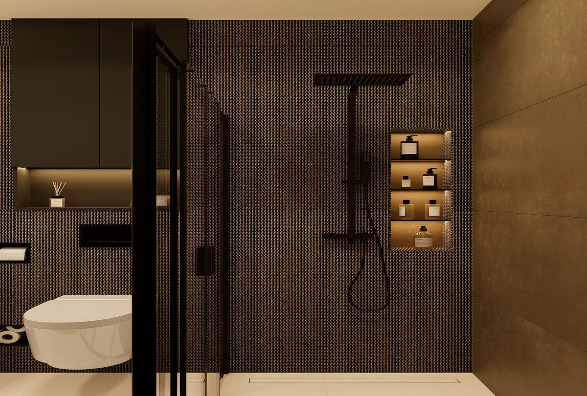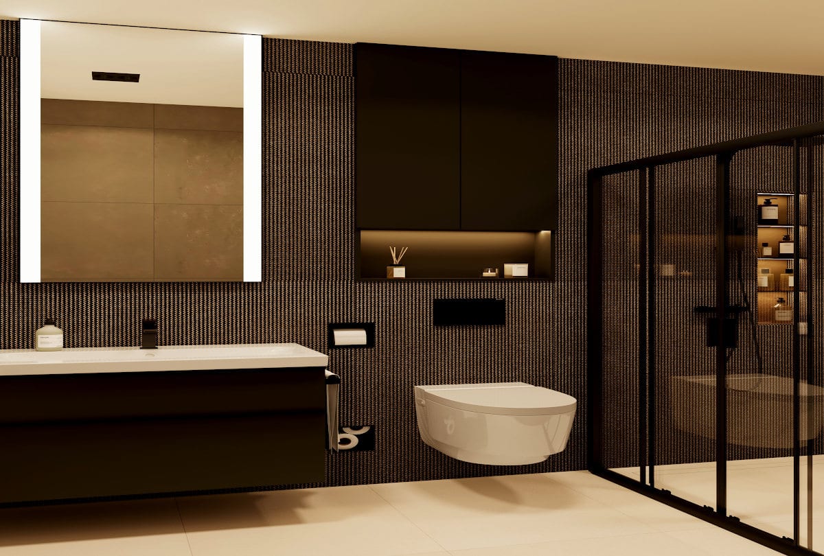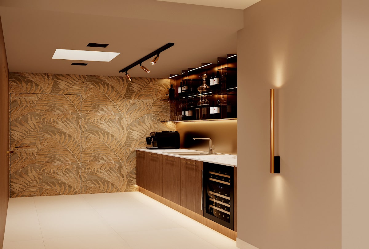 A földszint maszkulinabb karakterét főként a fürdőszobák sötétebb, határozottabb hangulata adja. A vendég WC a lépcső alá került, és egy hangulatos bárszekció is helyet kapott, borhűtővel és kávézó sarokkal. Innen tapétaajtó nyílik a kamrába, míg a háztartási helyiség burkolt falai mögött mosókonyha és gépészeti helyiség található.