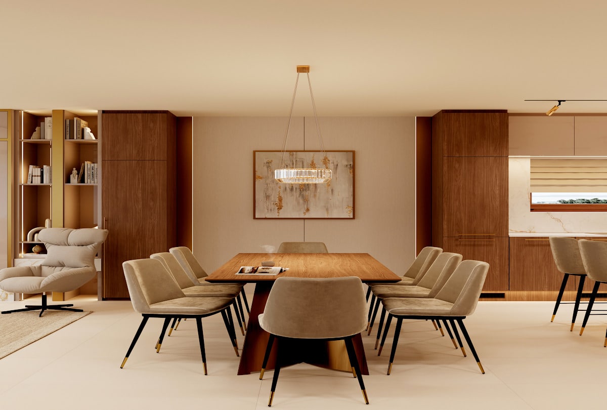 A nappaliból pazar kilátás nyílik az egész városra. Az egybefüggő üvegfelületek, a médiafal és a polcrendszer pedig látványos fókuszpontokat adnak. A kényelmet egy hatalmas U-alakú kanapé biztosítja. Az étkező klasszikusan elegáns, a szülői háló pedig gardróbbal, saját fürdővel és fésülködő asztallal válik igazán személyessé.