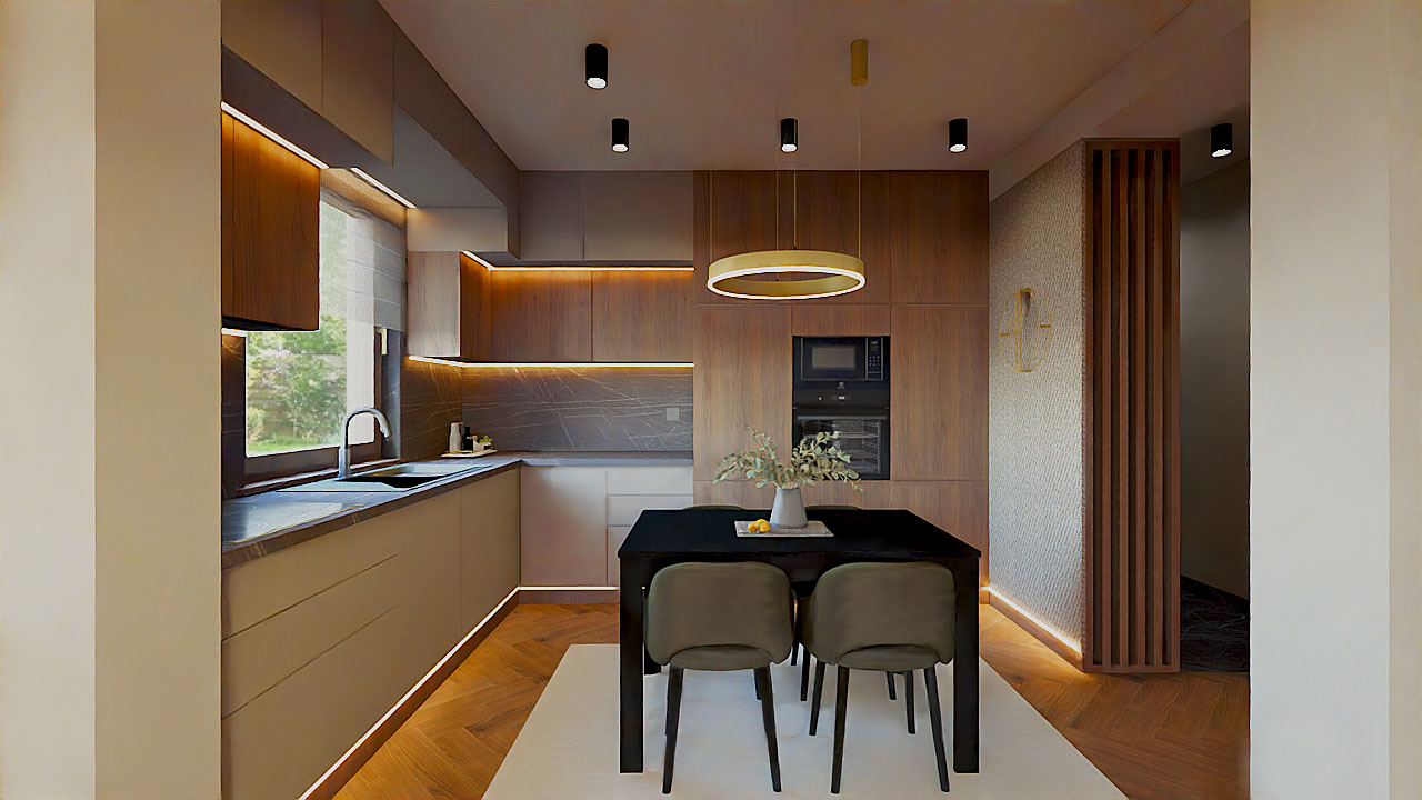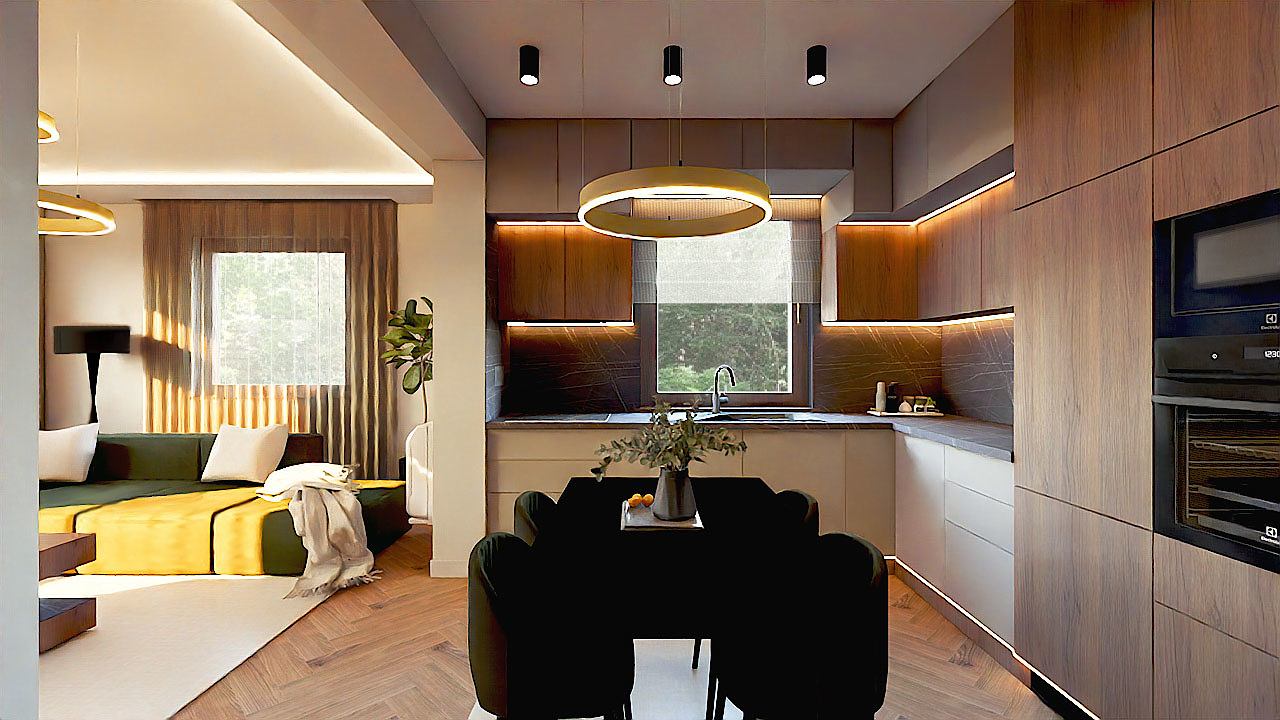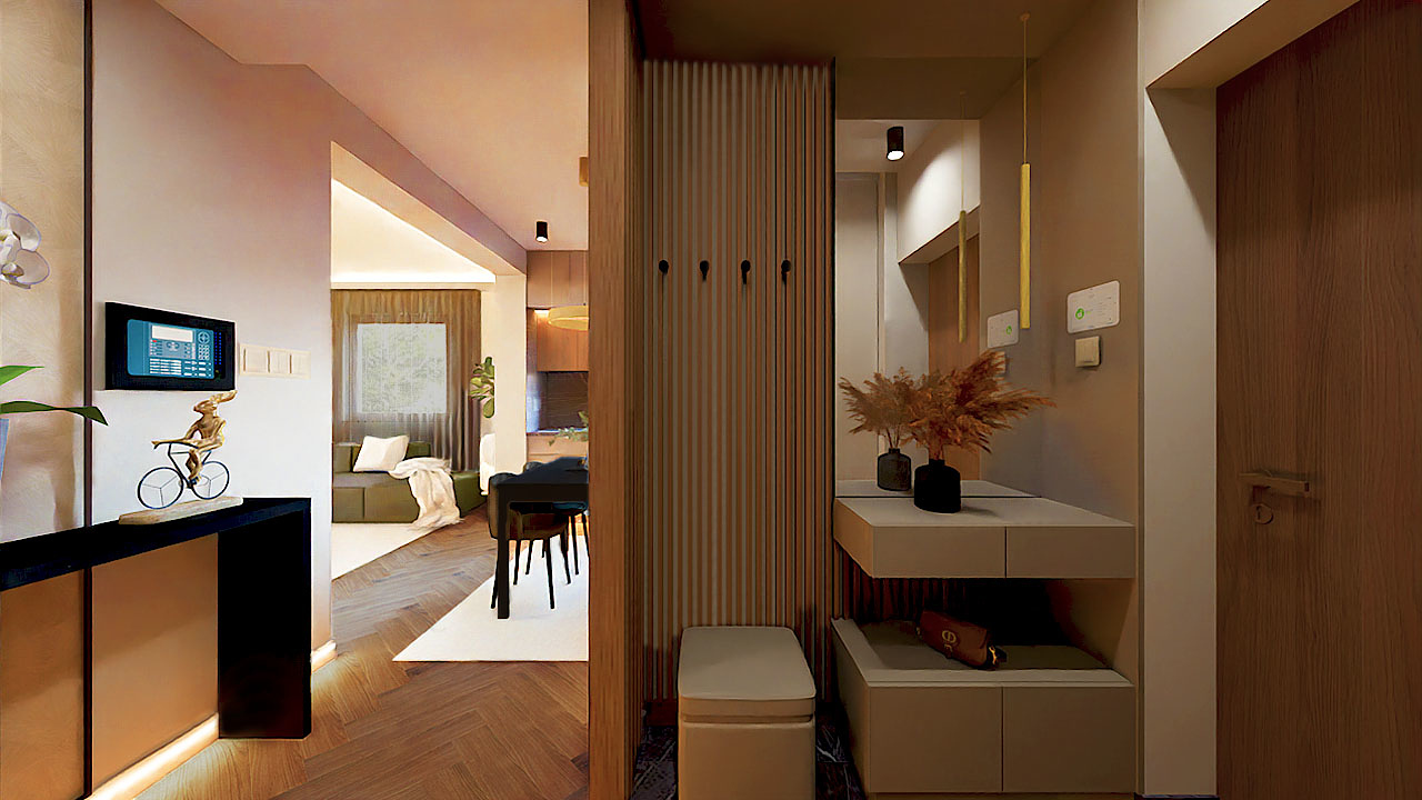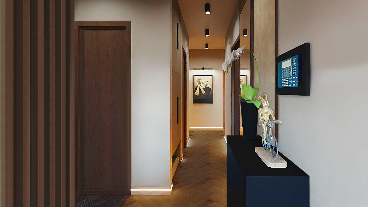 Az egyik fontos feladat az volt, hogy egy térben ki legyen alakítva az előszoba egy mini gardróbhelyiséggel és a konyha. A gardróbhelyiség a régi mosdóban kapott helyet teljesen új köntösbe bújtatva. Helytakarékossági szempontok miatt végül egy falba építhető tólóajtó került beszerelésre, mely rendkívül jó megoldásnak bizonyult. Esztétikus, modern és minden falfelület szabadon tervezhető maradt. Az előszoba funkcionális és térelválasztó egyben, amely bútorlapokból készült egyedi asztalosmunka eredménye. A térelválasztó lamellának köszönhetően ez a helyiség is kap természetes fényt, továbbá nagyon szépen lezárja az előszobát. A lehelyezett fekete matt márványlapok csodásan mutatnak, amelyek visszaköszönnek a nappaliban is az elektromos kandalló burkolataként. A praktikusan kialakított L alakú konyha gyönyörű és minden szükséges funkciót magába foglal. Az előszoba konyhai oldala nagyon szép és stílusos tapéta borítást kapott, ennek eredményeként sikerült széppé varázsolni a nagy üres bútorfelületet. Szintén egyedi asztalosmunka a konyha és folyosó lábazata, melybe Led szalag került beépítésre, egyedi hangulatot biztosítva a lakásnak.
