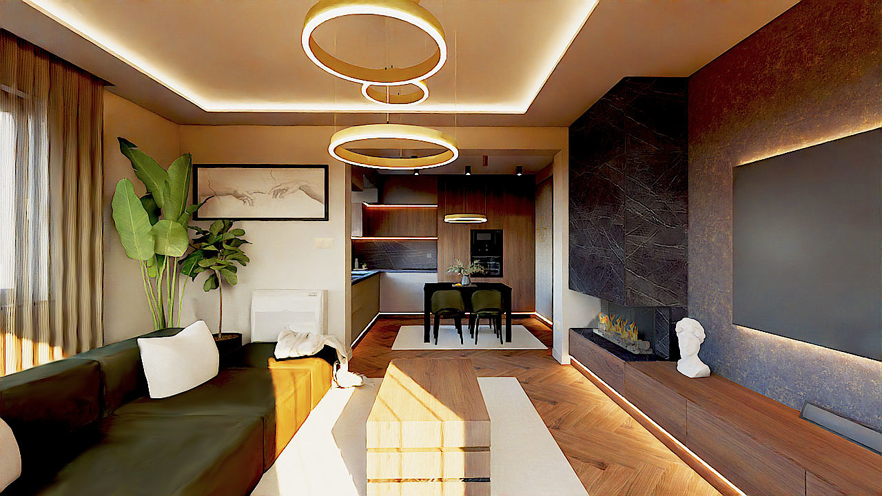 Ügyfeleim kedvelik a sötét színeket, ezért bátran használtam őket figyelve arra, hogy a világos színekkel megteremtsem az egyensúlyt. A nappaliban az elektromos kandalló márványburkolata elegáns és különleges a TV mögötti területre hozzá illő szintén sötét tapétát választottam. A modern és letisztult olívazöld ülőgarnitúra életre kelti a nappalit, a köríves fotel pedig megtöri a négyszögletes formákat és egy kis puhaságot csempész a térbe. A halszálkamintás parketta visszahozza régi idők hangulatát és tökéletesen illeszkedik a koncepcióba.