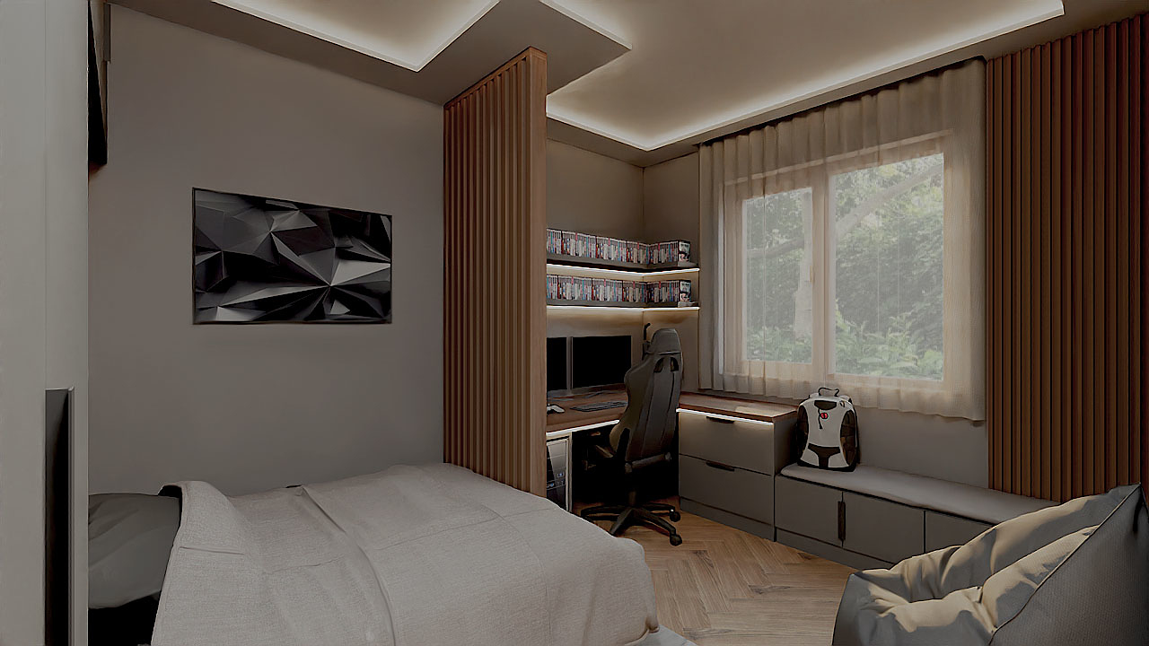 A kis tinifiú szobája modern és egyben hangulatos, minden funkciót sikerült kialakítani. A beépített szekrények elegendő tárolóhelyet biztosítanak, a fényáteresztő lamella tökéletesen elválasztja egymástól a tanulósarkot és az ágyat. Az L alakú íróasztal kényelmes és elegendő helyet kínál, míg az ablak alatti szekrénykék ülőalkalmatosságként és tárolóként funkcionálnak. Ami a legfontosabb, hogy a lakója imádja! 😊