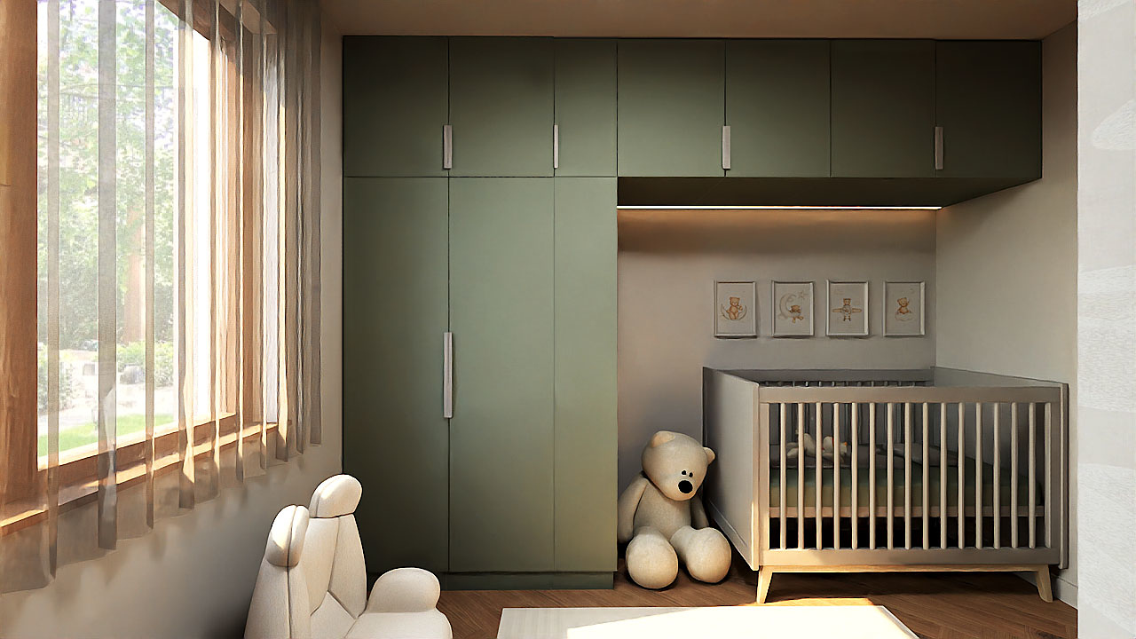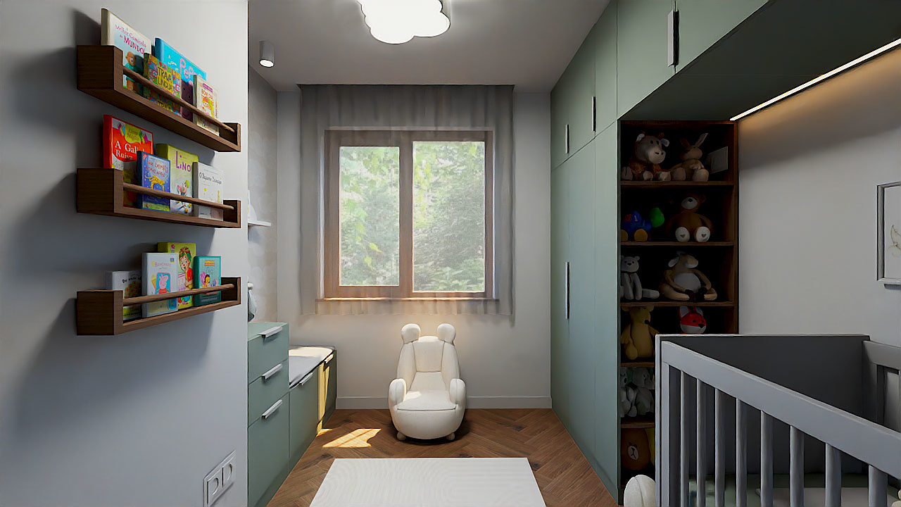 A babaszoba maga a cukiság, a színeivel, a felhős tapétával és a macis fotellel. Ebben az esetben is fontos volt az előrelátás. Azt szerettem volna elérni, hogy a baba növekedésével párhuzamosan könnyedén lehessen formálni a berendezést. Ezért a beépített szekrény kialakításánál elegendő helyet biztosítottam a jövendőbeli tiniágy zökkenőmentes elhelyezésére. Az ablak melletti kis tárolós, ülőkés bútor helyére behelyezhető lesz az íróasztal. A bútorok színei nagyobb korban is megállják a helyüket. 😊