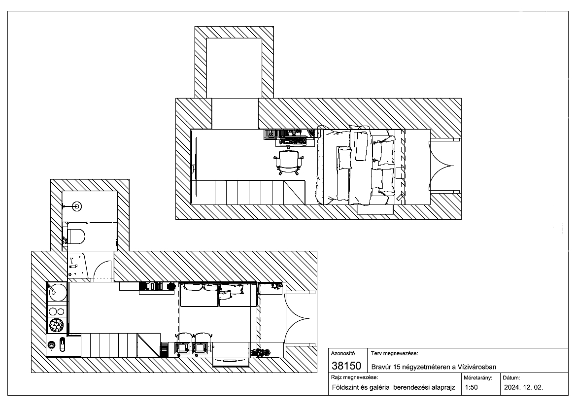 Nem volt kérdés, hogy helynyerés céljából felfelé kell terjeszkedni, hiszen a 6 méteres, csodás boltíves mennyezet alatt erre van lehetőség. Az is biztos volt, hogy minden bútort egyedileg kell legyártatni, hiszen a rendelkezésre álló teret maximálisan ki kell használni. A galériaépítés egyértelmű volt, de a méretezése okozott némi fejtörést, ugyanis a mosdó 365 cm-es bejáratát úgy kellett megosztani, hogy a leendő fürdő álmennyezete fölött kialakuló kis alkóv még fentről megközelíthető legyen. Ezért került a galéria szintje 2 m magasra. A belmagasság azonban bőven megengedné, hogy a lenti tér tágasabb legyen, ezért a galéria bejárathoz közeli részét magasabbra terveztem. Ez a lépcsőzetesség több szempontból is hasznos. Lent kellemesebb a térérzet, fent viszont kialakult egy dobogó, amire egy 190 cm széles, vastag matrac került, így itt egy igazán kényelmes hálórész alakult ki. Mellette elfér egy kis home office, asztallal, polcokkal, az egyetemista fiú itt nyugodtan tud tanulni és játékszenvedélyének hódolni. A bejárati ajtó fölötti félköríves ablak az egyetlen szellőztetési lehetőség, ezért ez kapott egy motoros vezérlést, így távirányítóval lentről és fentről egyaránt lebillenthető.